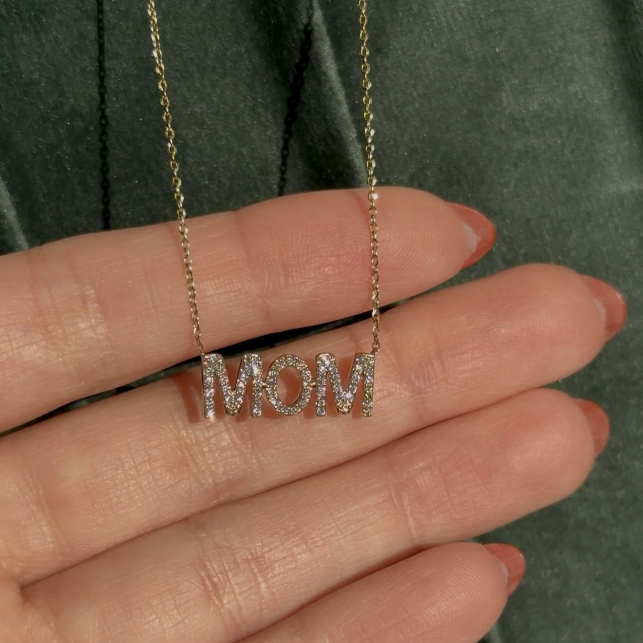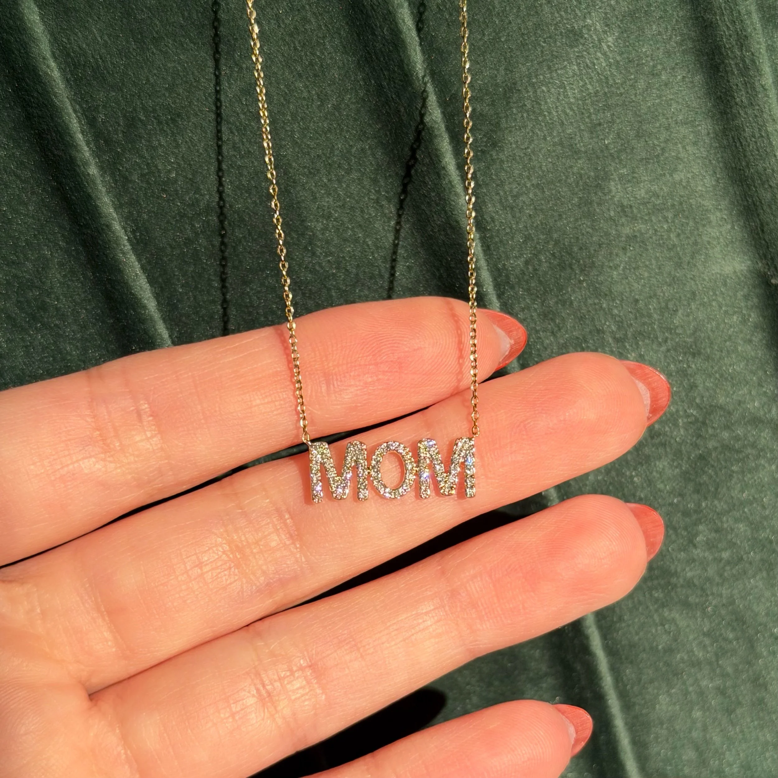 A cute and sentimental statement. This “mom” necklace includes .25ct natural diamonds and can be worn at 16, 18, or 20 inches. White gold is available upon request.