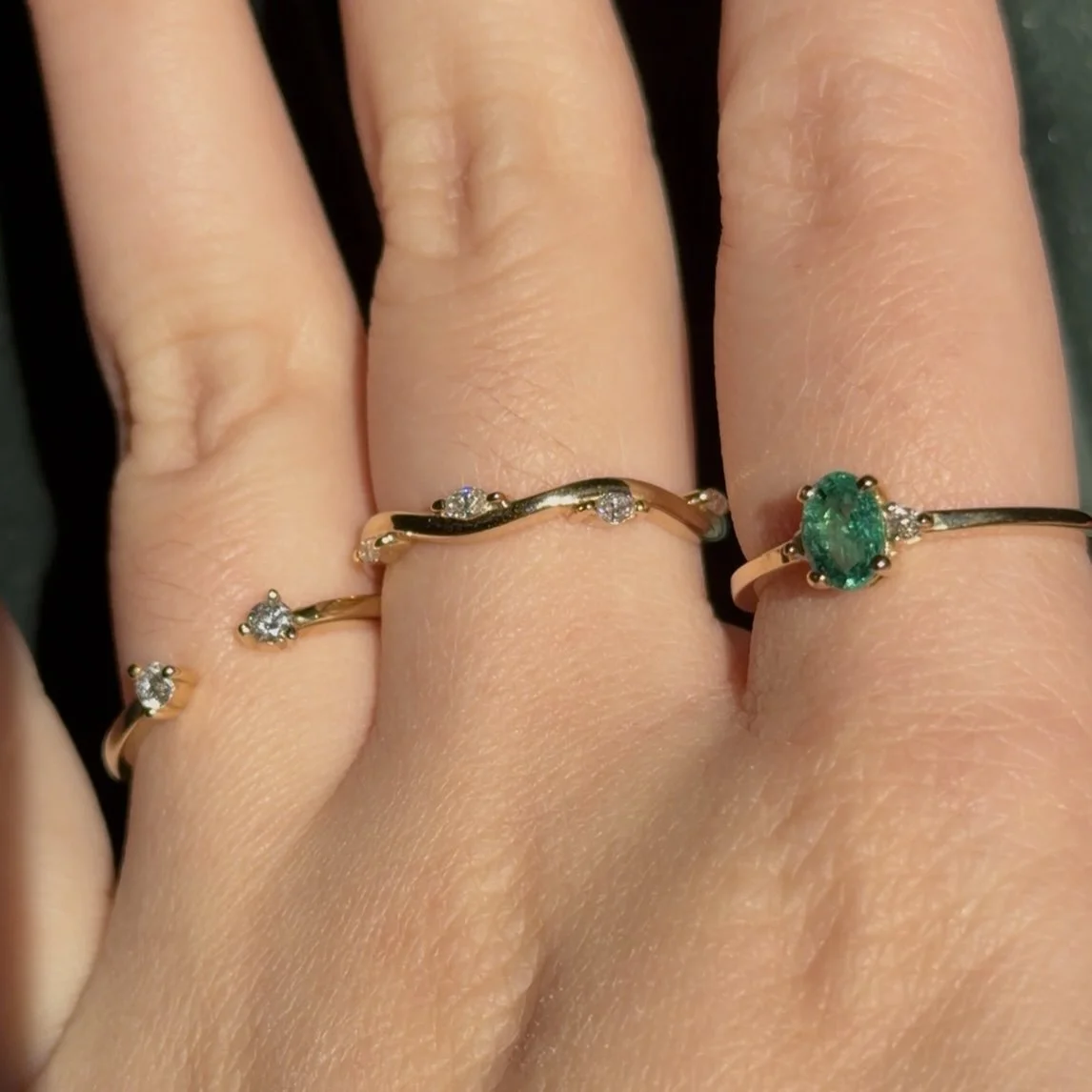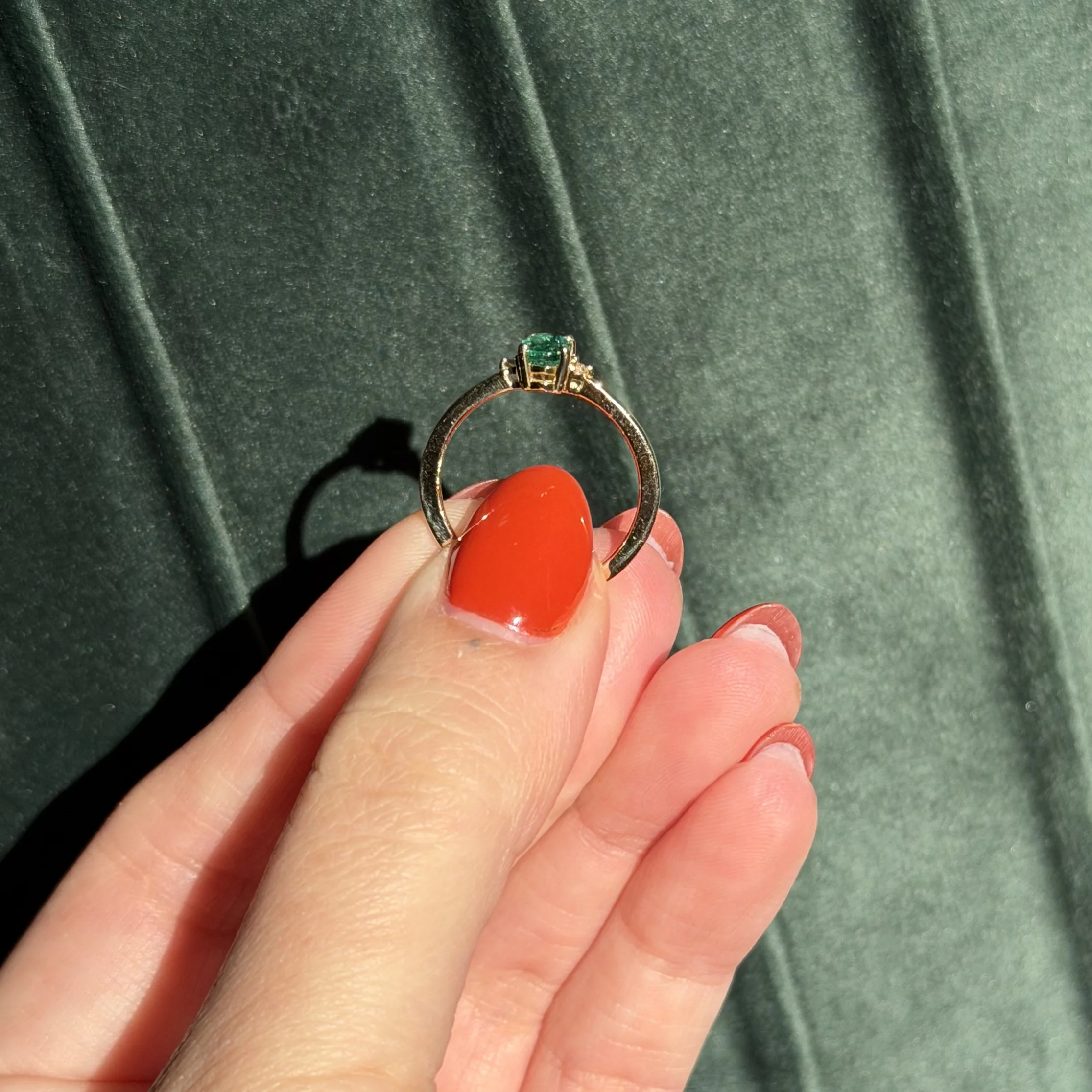 14k yellow gold emerald and diamond ring featuring a .52ct 6x4mm oval emerald flanked by .04cts of natural diamonds. This ring is currently at a 6.5 but is sizable for an additional fee.