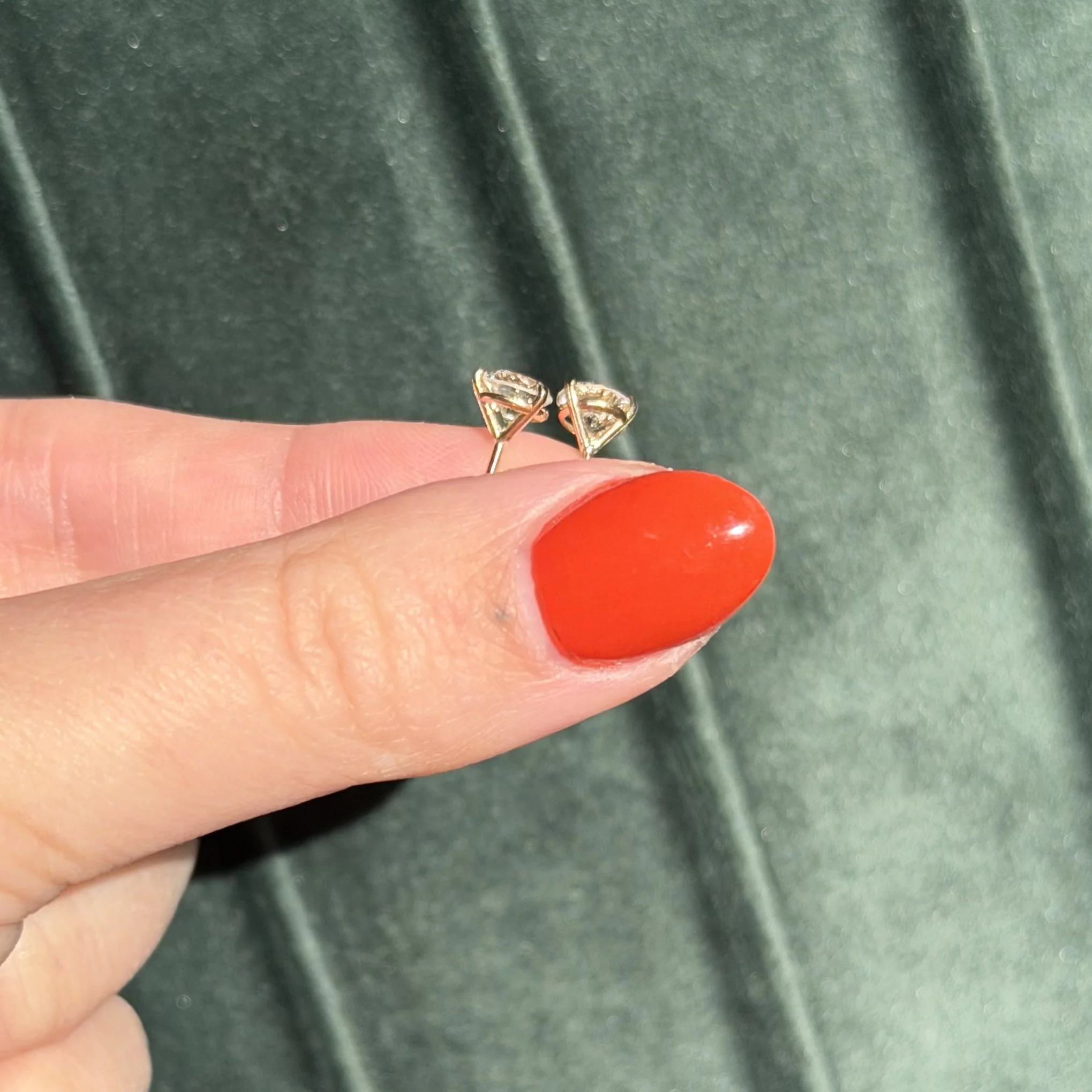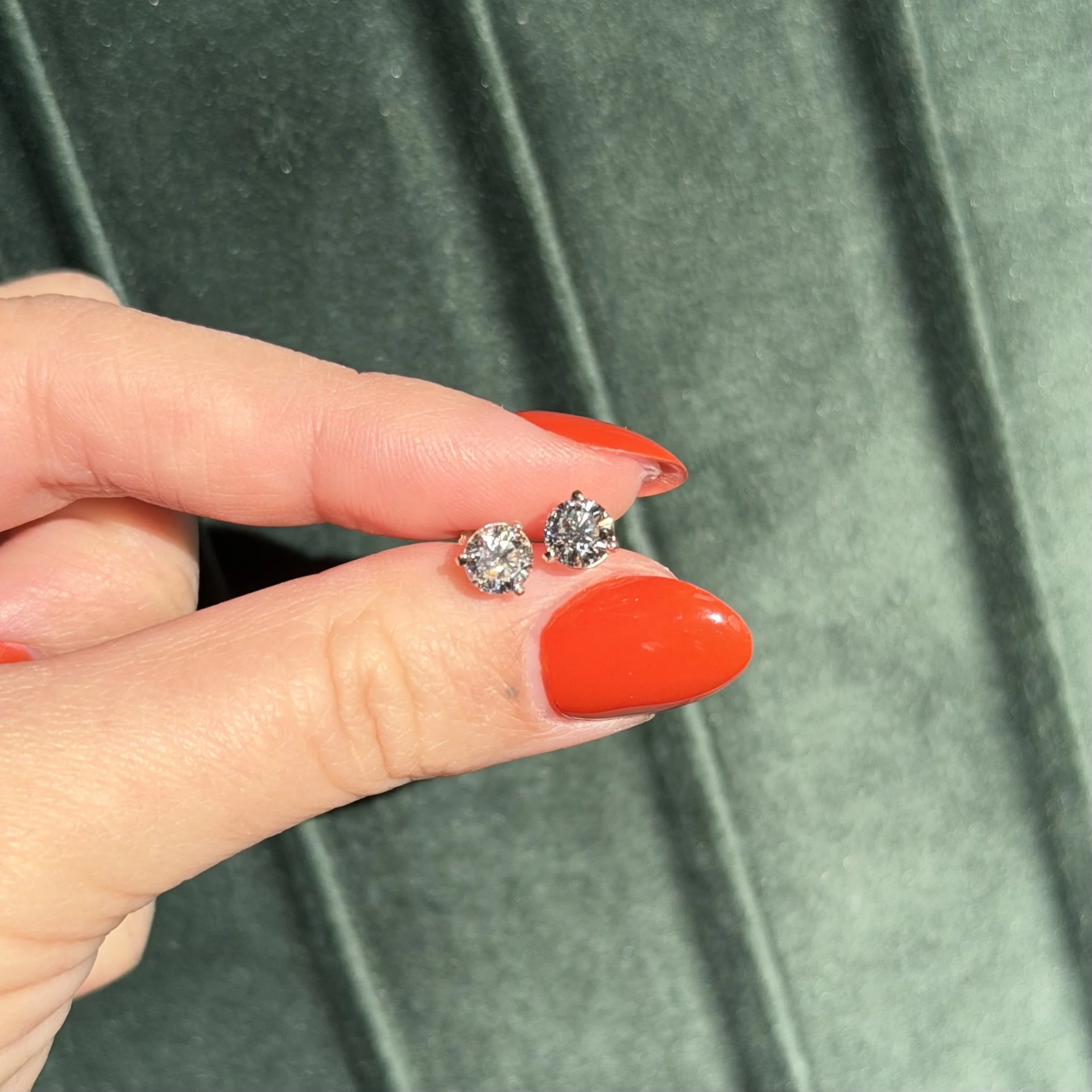14k yellow gold 3-prong martini stud earrings featuring 1 ctw lab grown F/VS2 diamonds. Available in other carat sizes and white gold upon request.